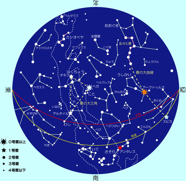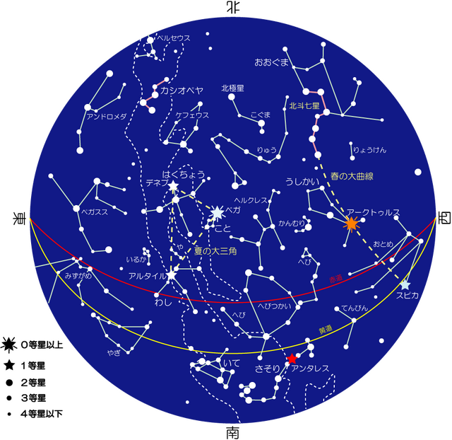 西の空に見えるオレンジ色の0等星「アークトゥルス」が目印の星座です。