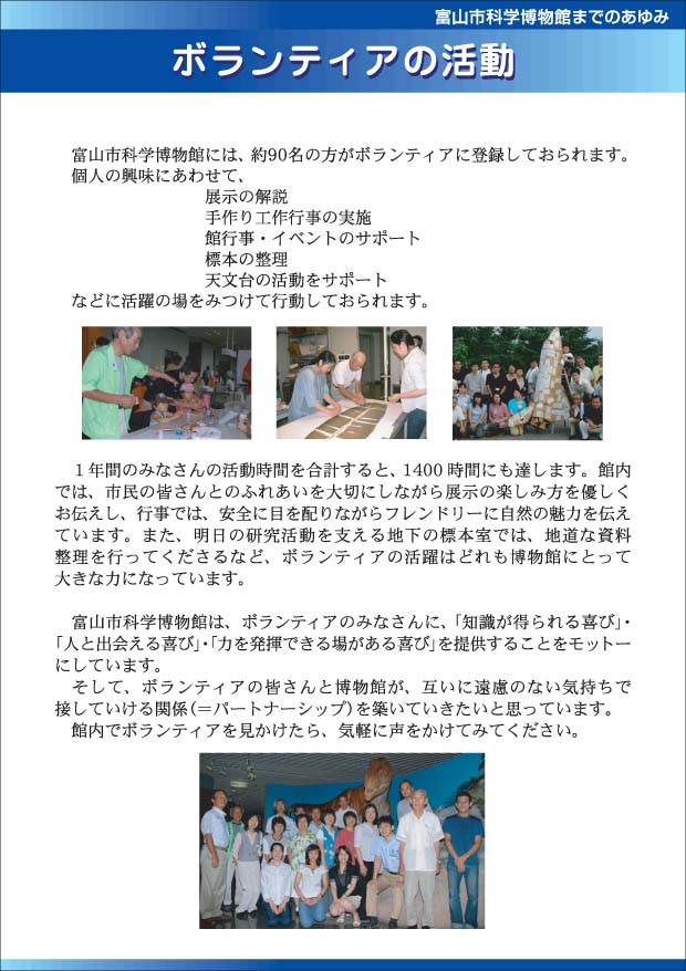 ボランティアの活動 展示の解説や行事などで活躍しているボランティアの活動を紹介します。 (PDF版) |