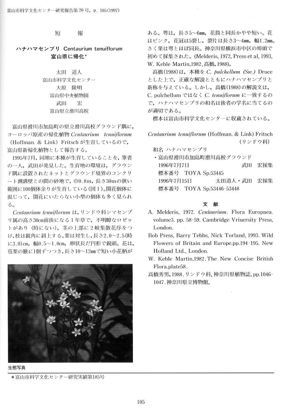- 富山県滑川市に生育していたリンドウ科のハナハマセンブリ(Centaurium tenuiflorum)を新帰化植物として報告した。
