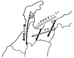 県内でも御鷹山、高峰など「タカ」のつく山は、殿様の鷹狩りの場所であったと伝えられたりしていますが、いくつかの山は春秋のタカの渡りのルートではなかろうかと予想するバードウォッチャーもいます。県南部の高清水断層や牛首断層に沿って「タカ」のつく山々が並んでいるのにも意味があるのかもしれません。富山県を通過するタカがどのようなルートで南をめざすのか、熱心な観察者によって調べられているので、いずれ明らかにされるのではないでしょうか。