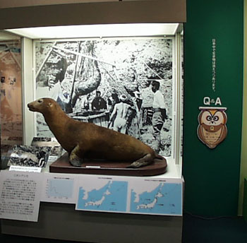 ニホンアシカは日本近海に広く分布し、太平洋側にはアシカと名のつく島が、日本海にはトドという名のつく地名(トドとアシカは混同されていた)が多く残っています。明治維新前には4-―5万頭が生息していたといわれ、日本海の竹島などでの毛皮や油をとるため乱獲され減少し、1975年以降記録がありません。竹島では1904年(明治37年)から7年間で11,000頭も捕獲されました。