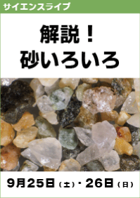 | サイエンスライブ「解説!砂いろいろ」 | 2021年9月25日(土)・26日(日)11:00–、14:00–(各回15分ほど) | 不要 | イベント |