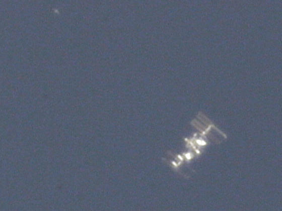 | この撮影のおよそ10分前の6時19分に、ロシアのプログレス補給船(47P)が国際宇宙ステーションから分離をしており、1秒間ほどですが一緒にいる様子を撮影することができました(この補給船のミッションについてはJAXAの47P解説ページに詳しいです)。右の写真の左上のところに写っているのがプログレス補給船です。 また撮影時のISSの状態はJAXAのHTV3解説ページに詳しいです。 |